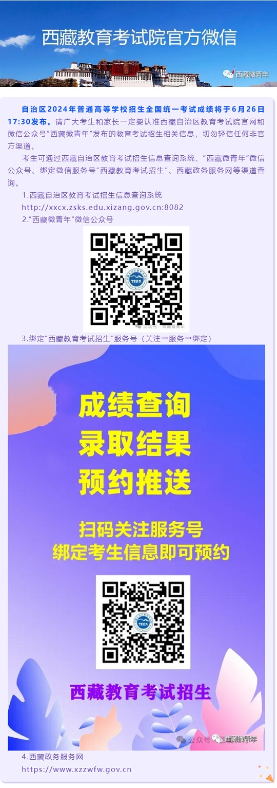 西藏:2024年普通高等學校招生全國統(tǒng)一考試成績將于6月26日17:30發(fā)布