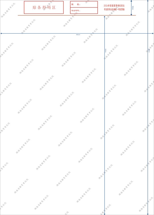 書(shū)法評(píng)卷采取計(jì)算機(jī)輔助評(píng)卷方式,要保持條形碼及條形碼粘貼區(qū)域(紅線以上區(qū)域,下同)清潔,嚴(yán)禁在條形碼上或條形碼粘貼區(qū)域涂抹。同時(shí),請(qǐng)考生按照《湖南省2026年普通高校招生書(shū)法類專業(yè)統(tǒng)一考試考生守則》(見(jiàn)附件1)做好相關(guān)準(zhǔn)備工作。