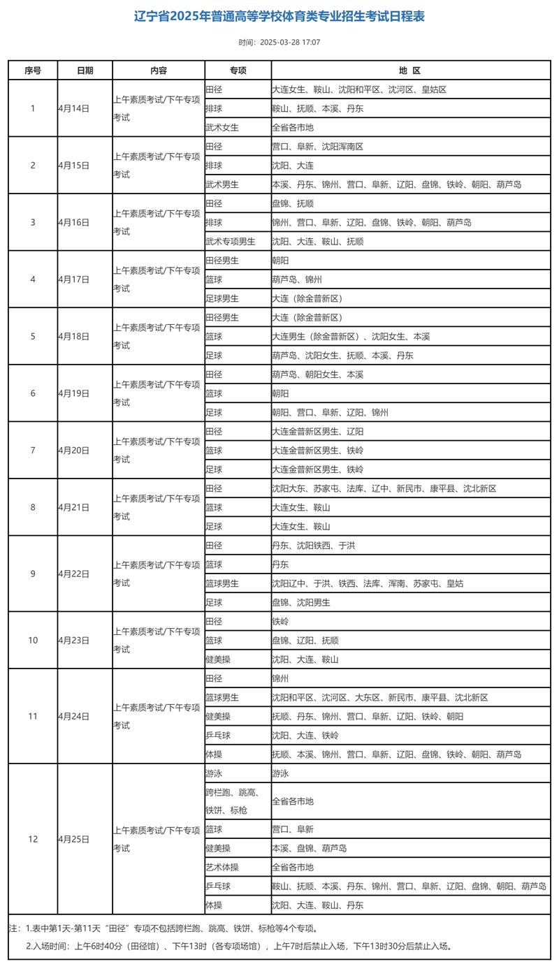 | 遼寧省2025年普通高等學(xué)校體育類專業(yè)招生考試日程表 |