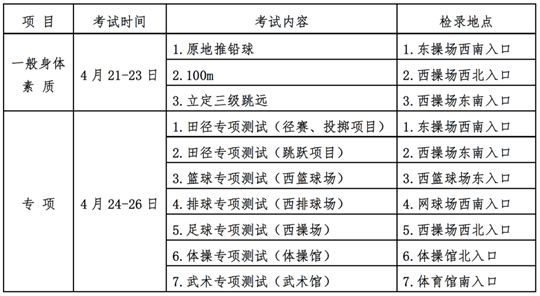 。ㄋ模y試采用分組輪換、集中測試的方式進行,4月21-23日為一般身體素質(zhì)測試,4月24-25日為專項測試,考生具體考試時間以《專業(yè)準(zhǔn)考證》上公布為準(zhǔn)。