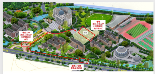 浙江工業(yè)大學屏峰校區(qū)(杭州市西湖區(qū)留下街道留和路288號),考生由浙江工業(yè)大學屏峰校區(qū)南門進入考點學校,學校南門距離地鐵3號線屏峰站B出口約300米、南門距離考場所在樓宇(健行樓B區(qū))約300米?忌目紙鎏柡妥恍畔⒃斠姕士甲C。