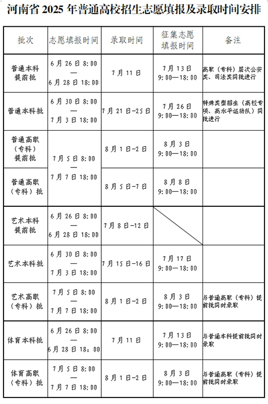 河南省2025年普通高校招生志愿填報及錄取時間安排