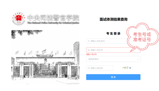 2025年已參加招生面試體檢體能測試的合格考生,請登錄中央司法警官學(xué)院官網(wǎng)“本科招生”網(wǎng)頁,點(diǎn)擊右下方“面試體測結(jié)果查詢”圖標(biāo)或登錄網(wǎng)址http://hbybm.cicp.edu.cn:8083/login,根據(jù)提示輸入姓名、考生號(hào)(無考生號(hào)的輸入準(zhǔn)考證號(hào))等信息或關(guān)注廣東省教育考試院官微,查詢面試體檢體能測試結(jié)果。