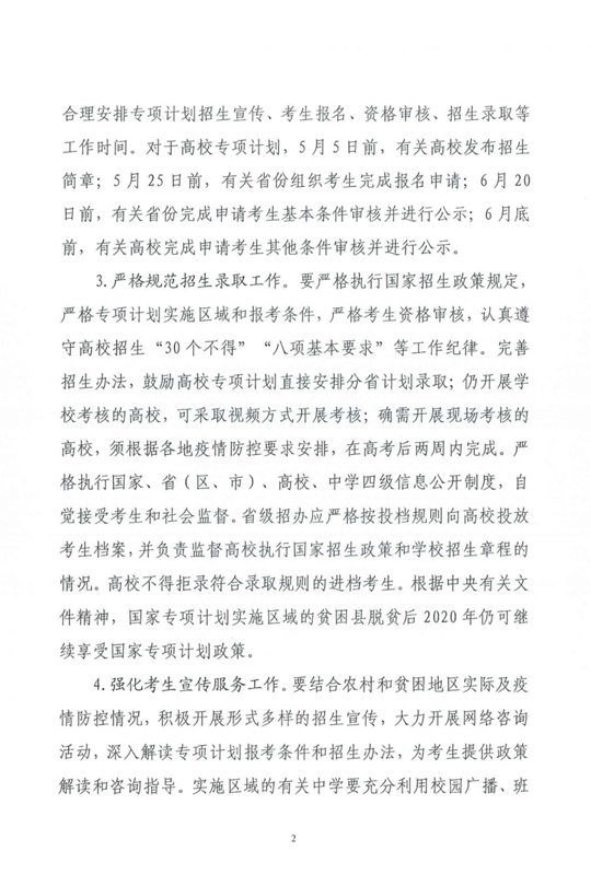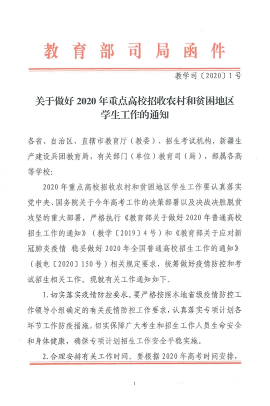 教育部辦公廳關于做好2020年重點高校招收農(nóng)村和貧困地區(qū)學生工作的通知