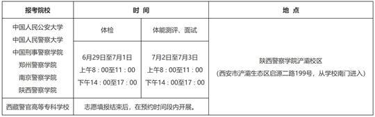 參加體檢的考生要提前進(jìn)行預(yù)約。經(jīng)陜西省教育考試院門戶網(wǎng)站公布的報考公安院校公安本科專業(yè)考生須于6月28日10∶00至17∶00,登錄陜西省公安廳門戶網(wǎng)站掃描二維碼后按要求預(yù)約體檢時間;經(jīng)陜西省教育考試院門戶網(wǎng)站公布的報考西藏警官高等?茖W(xué)校的考生須于志愿填報結(jié)束后次日,登錄陜西省公安廳門戶網(wǎng)站掃描二維碼后按要求預(yù)約體檢時間。預(yù)約成功的考生按預(yù)約時間,攜帶居民身份證、戶口本、準(zhǔn)考證、《政治考察表》、《2025年陜西省普通高等學(xué)校招生體檢表》(由各縣(區(qū))招生辦負(fù)責(zé)提供復(fù)印件)及《公安院校公安專業(yè)招生考生患病經(jīng)歷申報表》(附件3,由本人如實填寫),按流程進(jìn)行體檢、體能測評和面試。體檢實行單項淘汰,體檢合格的考生方可進(jìn)入體能測評和面試環(huán)節(jié)。具體時間及地點安排如下: