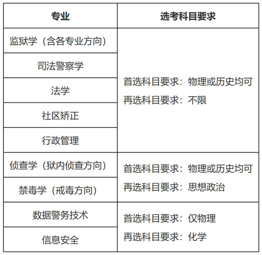 報(bào)考中央司法警官學(xué)院偵查學(xué)(獄內(nèi)偵查方向)、禁毒學(xué)(戒毒方向)必選政治科目,數(shù)據(jù)警務(wù)技術(shù)、信息安全必選物理、化學(xué)科目,其他專業(yè)選考科目不限。各專業(yè)選考科目要求見下表: