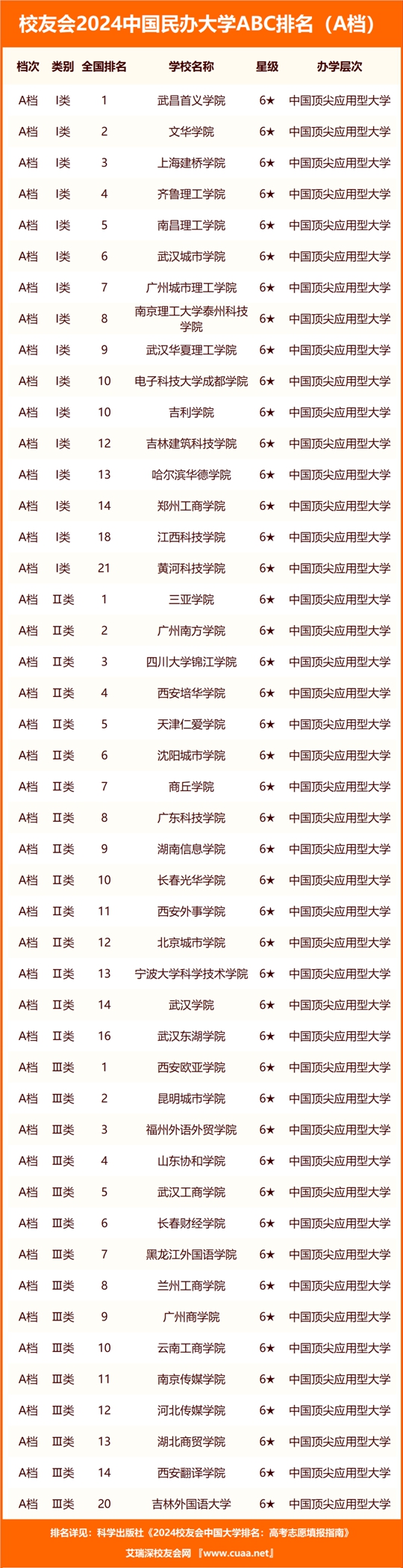 | 校友會2024中國民辦大學(xué)ABC排名,武昌首義學(xué)院等46校居第一檔 |