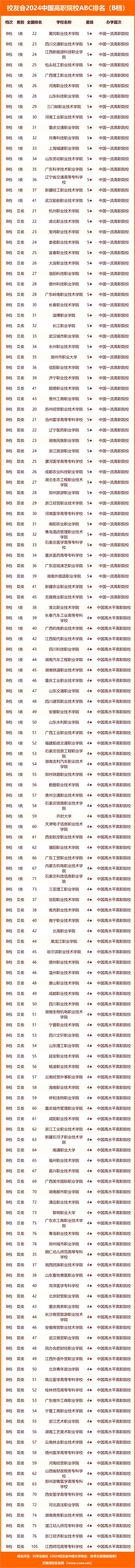 深圳信息職業(yè)技術(shù)學(xué)院、黃河水利職業(yè)技術(shù)學(xué)院、無(wú)錫職業(yè)技術(shù)學(xué)院、長(zhǎng)沙民政職業(yè)技術(shù)學(xué)院、江西應(yīng)用技術(shù)職業(yè)學(xué)院、陜西工業(yè)職業(yè)技術(shù)學(xué)院等榮膺2024中國(guó)六星級(jí)高職院校(6★)美譽(yù),躋身中國(guó)頂尖高職院校行列,雄居校友會(huì)2024中國(guó)理工類高職院校ABC排名最高檔,獲評(píng)A檔。