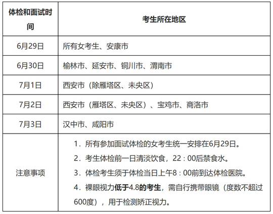 6月29日至7月3日,同步展開面試和體格檢查。由省軍區(qū)招生工作辦公室牽頭協(xié)調(diào),依托空軍軍醫(yī)大學組織實施,承檢醫(yī)療機構為空軍第九八六醫(yī)院(北區(qū)),地址為西安市碑林區(qū)友誼東路269號。參加面試、體格檢查的考生須攜帶第二代居民身份證、準考證、學籍所在高中出具的高中階段體質(zhì)測試及格證明(即高中階段《國家學生體質(zhì)健康標準》登記卡)。參檢前請認真閱讀《體檢須知》(見附件1)。