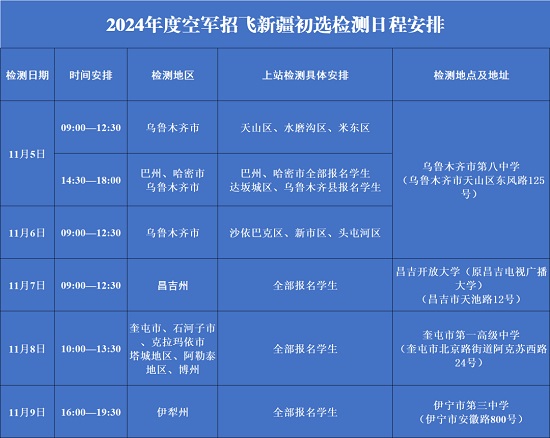 根據(jù)年度空軍招飛工作安排,我們將于2023年11月5日至11月9日開展新疆2024年度空軍招飛初選檢測工作,F(xiàn)將具體事項通知如下: