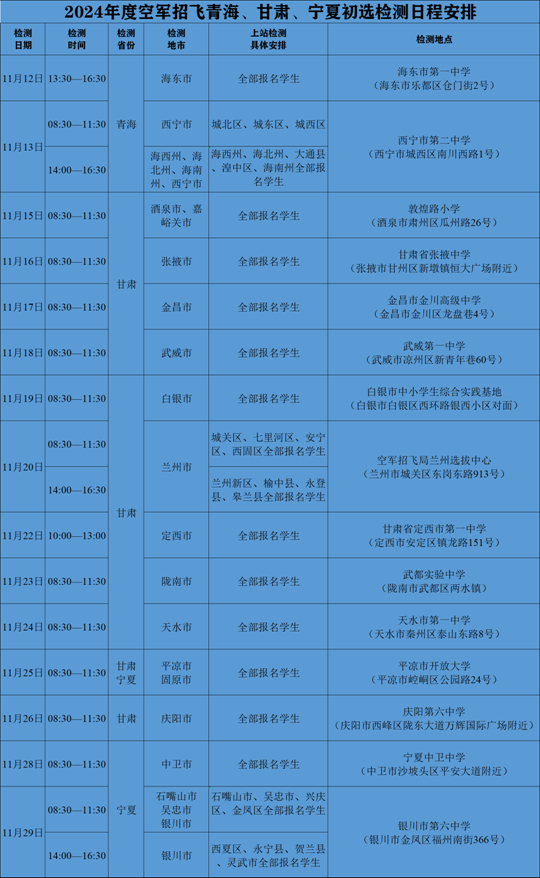 根據(jù)年度空軍招飛工作安排,我們將于2023年11月12日至2023年11月29日開展青海、甘肅、寧夏2024年度空軍招飛初選檢測工作,F(xiàn)將具體事項通知如下: