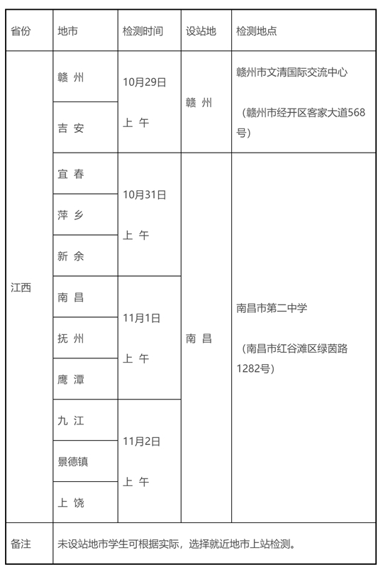 檢測為當天上午8:00-12:00,各地市檢測地點及日程安排如下: