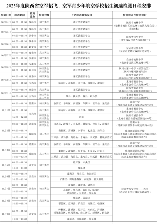| 2025年度陜西省空軍招飛及青少年航空學(xué)校招生初選檢測(cè)安排 |