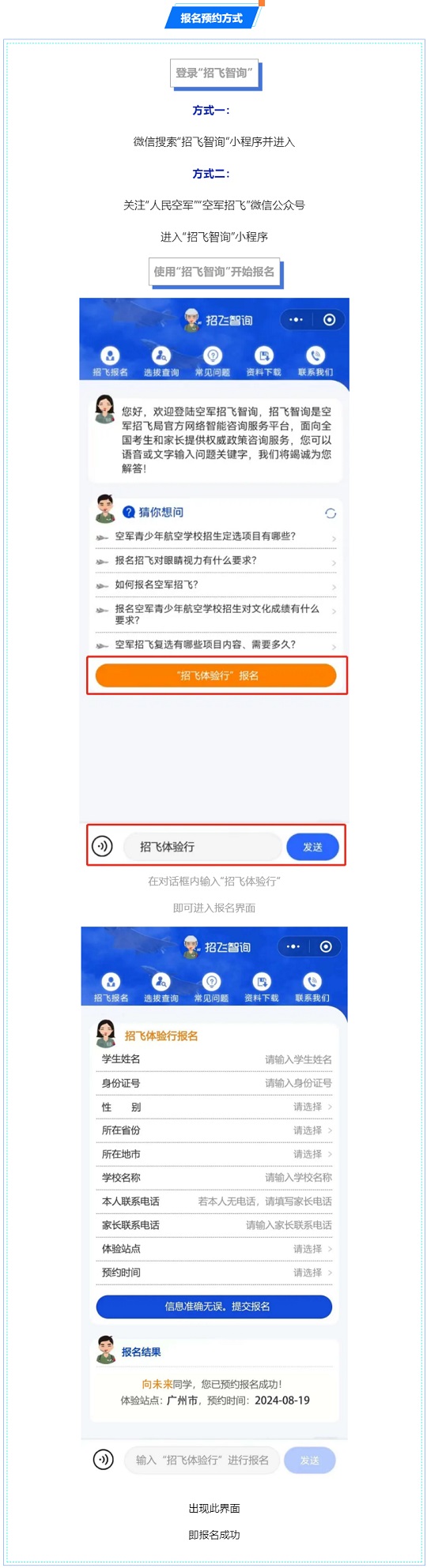 主要面向全國(guó)初、高中青少年,按照本人自愿、家長(zhǎng)支持的方式報(bào)名參加,可通過(guò)“招飛智詢”微信小程序預(yù)約報(bào)名。