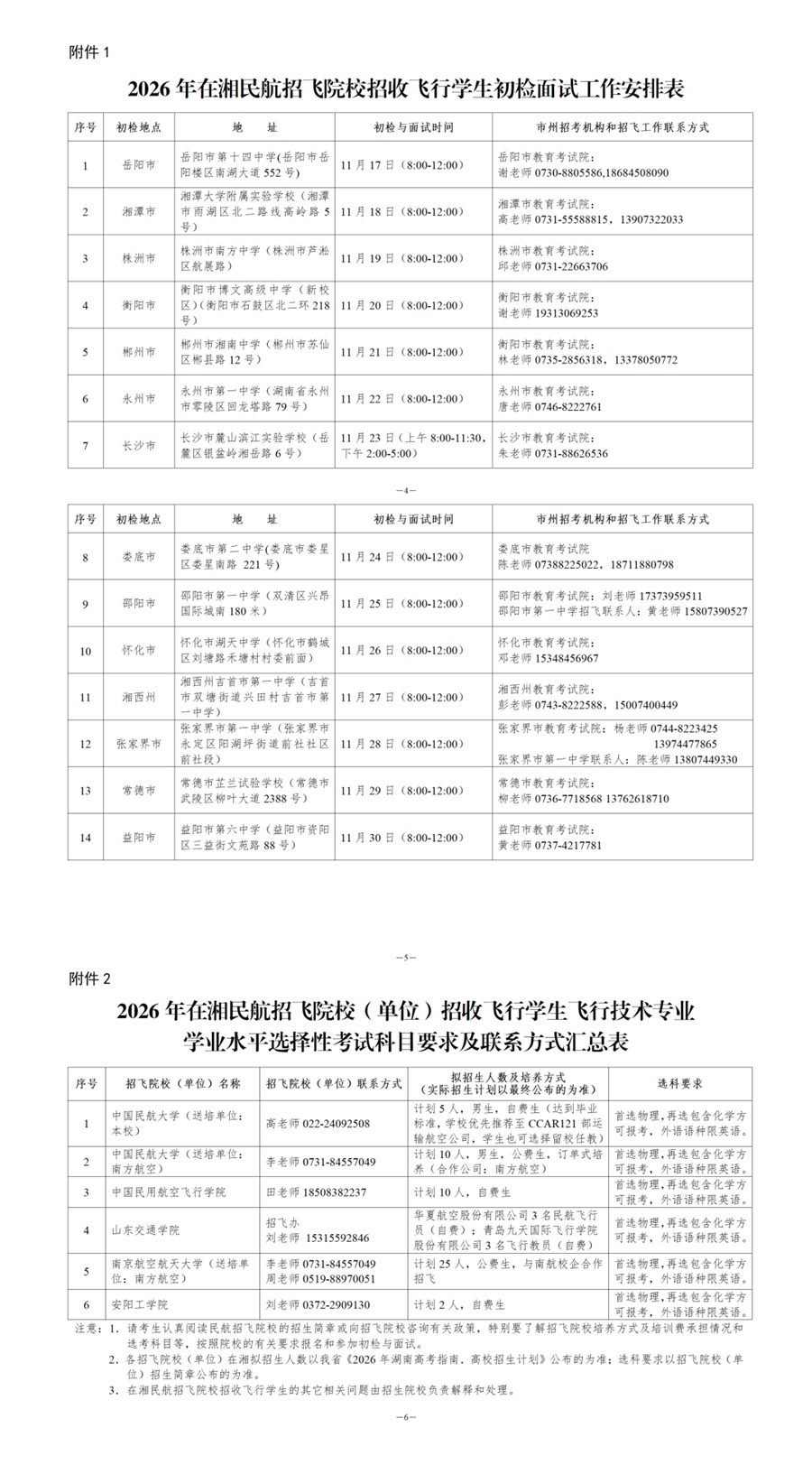附件:1.2026年在湘民航招飛院校招收飛行學(xué)生初檢面試工作安排表