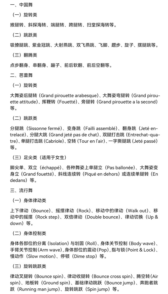 。4)個人技術(shù)技巧部分內(nèi)容:跳、轉(zhuǎn)、翻單一動作展示,總時長不超過1分鐘。附件中所列的技術(shù)技巧動作供考生參考。
