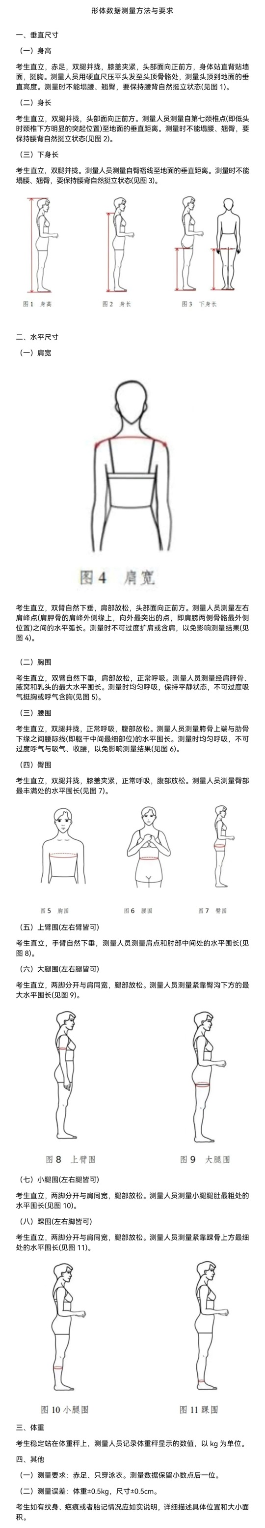 。2)考試形式與要求:考生先完成形體測(cè)量(測(cè)量方法與要求附后),然后5-10位考生為一組進(jìn)行正面、側(cè)面、背面體態(tài)展示:要求赤足、著泳裝,其中女生著純色、分體、不帶裙邊泳裝,男生著純色泳褲。