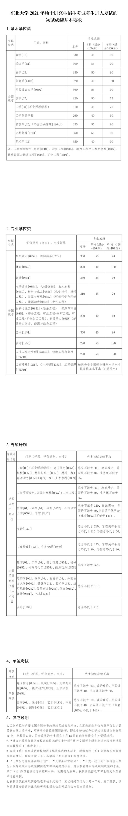 | 東北大學(xué)2021年碩士研究生招生考試考生進(jìn)入復(fù)試的初試成績(jī)基本要求 |
