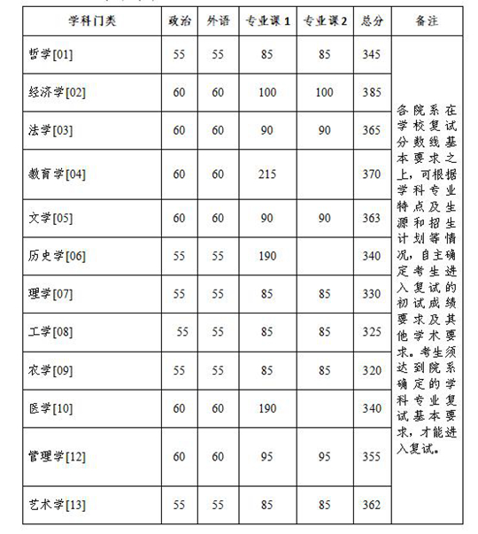 1.總分成績要求:按照所報(bào)考專業(yè)在上述兩表中學(xué);痉?jǐn)?shù)線的總分降低1.5%;