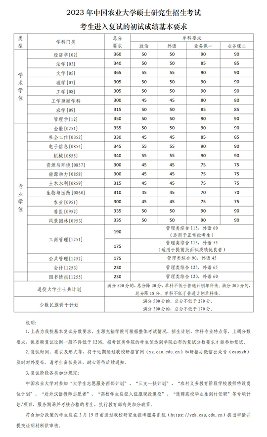 | 2023年中國農(nóng)業(yè)大學碩士研究生招生考試考生進入復試的初試成績基本要求 |