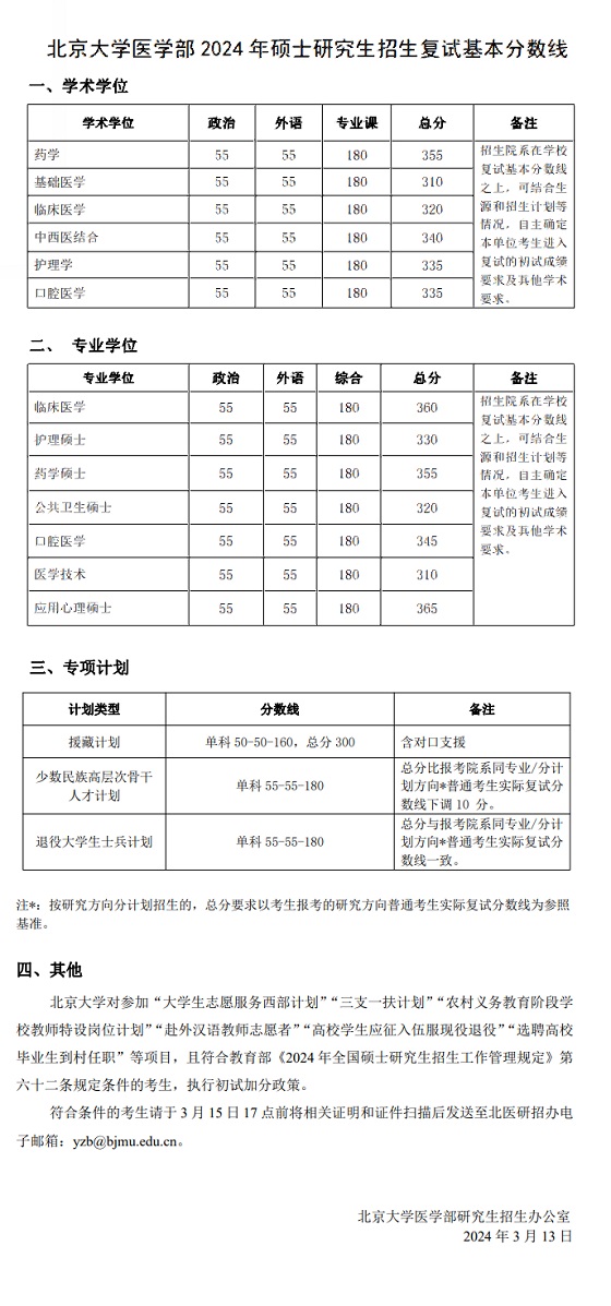 北京大學(xué)醫(yī)學(xué)部2024年碩士研究生招生復(fù)試基本分?jǐn)?shù)線