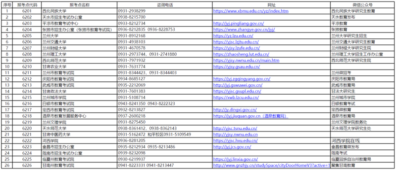 | 甘肅省2026年全國碩士研究生招生考試各招生單位和報考點(diǎn)聯(lián)系方式 |