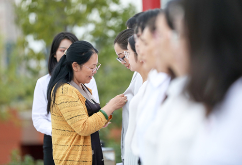 隨后,校黨委副書記、執(zhí)行校長徐愛民,組織部部長黃巖及青島第五屆高校教學(xué)名師獲得者莊新穎、單菁華為新進教師佩戴;。