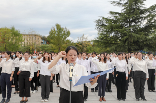 學(xué)校優(yōu)秀教師代表,馬克思主義學(xué)院教師劉鎖霞領(lǐng)誓。全體新入職教師舉起右手面對國旗和校旗莊嚴宣誓,志愿做一名光榮的人民教師,對黨和人民的教育事業(yè)進行了莊嚴承諾。