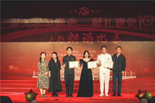 參賽隊伍按照順序依次表演,最終成績以朗誦內(nèi)容30%、語言表達及技巧40%、創(chuàng)新30%的比例進行現(xiàn)場評分。經(jīng)過激烈角逐,同學們的精彩表演也獲得了滿堂喝彩。最終,外語系英語20208團支部獲得了一等獎、計科系計算機20207團支部獲得了二等獎、數(shù)藝系數(shù)字媒體專業(yè)獲得了三等獎。王小卉老師、王梓老師及黃嘉慶老師為獲獎隊伍代表頒獎。