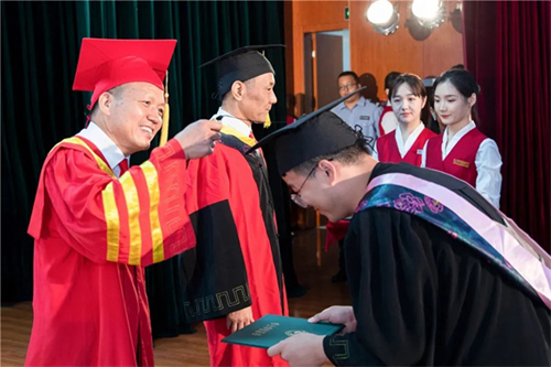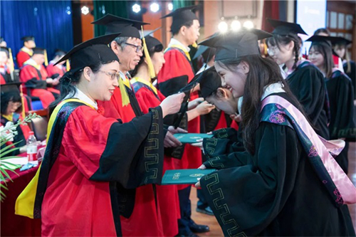 紅領(lǐng)黑緞,流蘇飛綠,在代表“教育的崇高和知識圣潔”的學位權(quán)杖見證下,畢業(yè)生代表一一向?qū)熅瞎膶熓种薪舆^學位證書。主席臺一側(cè),學生家長和師生依次迎接畢業(yè)生,獻上鮮花表示祝賀,F(xiàn)場氣氛隆重而感人。