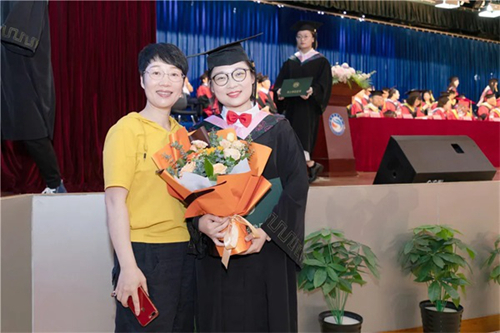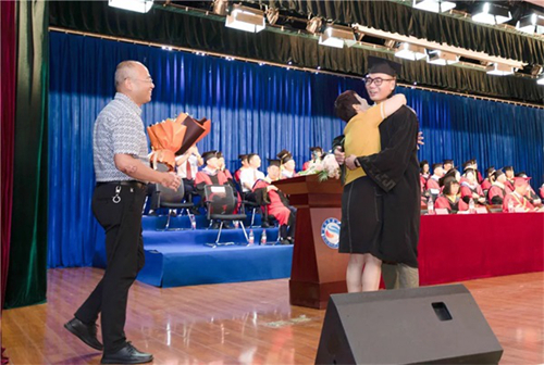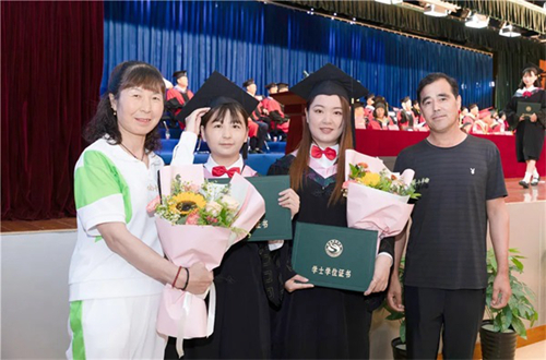 畢業(yè)生家長為畢業(yè)生獻花并表示祝賀