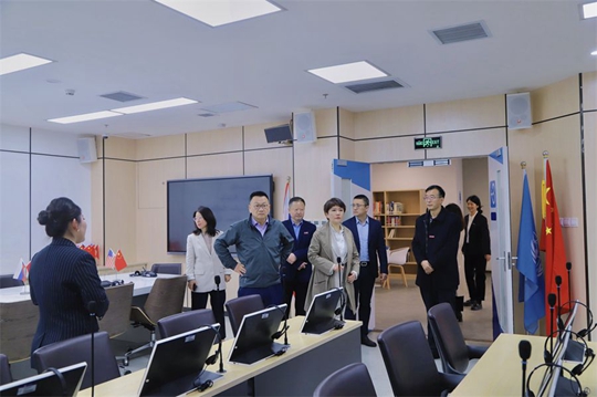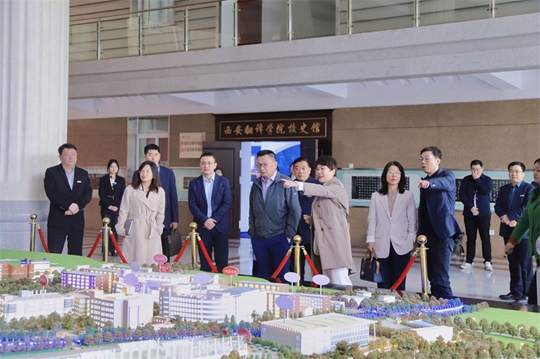 在學(xué)校沙盤前,丁晶向來賓們介紹了學(xué)校的整體布局。隨后,在丁晶等校領(lǐng)導(dǎo)的帶領(lǐng)下,胡建波一行實地參觀了西安翻譯學(xué)院校史館、國際商學(xué)院教學(xué)樓、文學(xué)與傳媒學(xué)院的空中乘務(wù)實訓(xùn)中心和新媒體與表演藝術(shù)實踐教學(xué)中心、東區(qū)學(xué)生公寓、外國語言與文化實踐教學(xué)中心、同聲傳譯實驗室、人工智能實驗室等現(xiàn)代化的教育教學(xué)場所以及在建的國際會議中心。隨著參觀深入,來賓們驚嘆于西譯的發(fā)展變化以及學(xué)校近年來在育人環(huán)境、內(nèi)涵建設(shè)、教育教學(xué)、人才培養(yǎng)等方面取得的輝煌成績。參觀中,兩校領(lǐng)導(dǎo)就學(xué);A(chǔ)設(shè)施改造、未來發(fā)展規(guī)劃等進行了深入溝通。