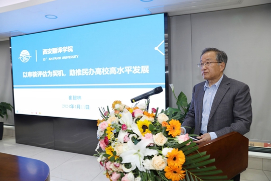 西安翻譯學院執(zhí)行董事、校長、陜西省教育考試與評價研究會民辦教育分會會長崔智林致辭并作報告