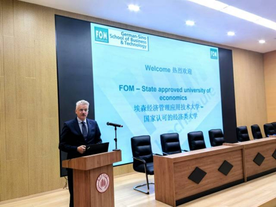 講座中,Andreas Stoffers教授圍繞FOM大學(xué)的課程體系與核心優(yōu)勢(shì)展開(kāi)分享。他詳細(xì)介紹了該校在應(yīng)用型人才培養(yǎng)方面的特色課程設(shè)計(jì),以及與行業(yè)接軌的教學(xué)模式,讓在場(chǎng)師生對(duì)德國(guó)高等教育的實(shí)踐導(dǎo)向有了直觀認(rèn)識(shí)。