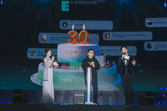 “祝你生日快樂(lè),祝你生日快樂(lè)……”當(dāng)天幕中的巨型生日蛋糕緩緩盤(pán)旋時(shí),西安歐亞學(xué)院創(chuàng)辦人、董事長(zhǎng)胡建波也為舞臺(tái)中央大屏幕里的“賽博蛋糕”點(diǎn)亮“電子蠟燭”,臺(tái)下觀眾齊聲合唱生日快樂(lè)歌,共同見(jiàn)證歐亞翻開(kāi)“而立”之頁(yè)。