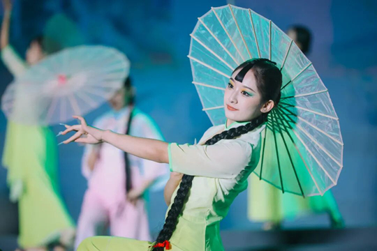 民舞團(tuán)的舞者撐著透明油紙傘輕盈舞動(dòng),將古典意境里雨打芭蕉的柔與靈,具象成指尖的婉轉(zhuǎn)以及裙擺的輕搖。