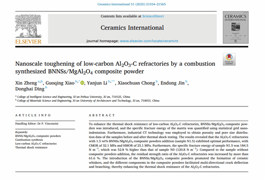 近日,西安培華學(xué)院智能科學(xué)與工程學(xué)院鄭欣博士團(tuán)隊(duì)在國(guó)際材料領(lǐng)域SCIE期刊《Ceramics International》發(fā)表題為《Nanoscale toughening of low-carbon Al₂O₃-C refractories by a combustion synthesized BNNSs/MgAl₂O₄ composite powder》的學(xué)術(shù)論文。該期刊創(chuàng)刊于1971年,由Elsevier Ltd出版,在中國(guó)科學(xué)院分區(qū)中屬材料科學(xué)大類2區(qū),為材料科學(xué)權(quán)威Top期刊,影響因子5.6,是國(guó)際公認(rèn)的材料科學(xué)權(quán)威刊物之一。