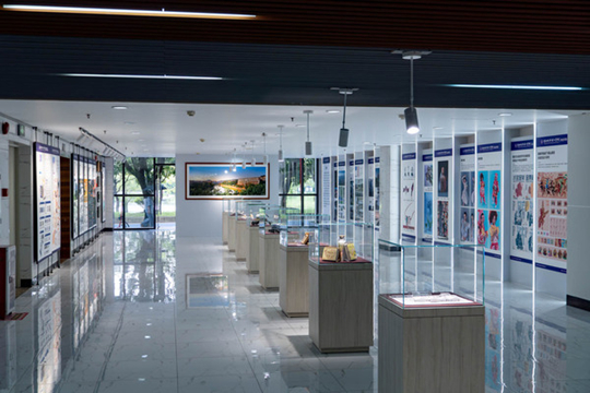 黨建思政育人基地位于行政樓一、二層,占地1330.56平方米,是立體化呈現(xiàn)黨史校史融合育人的重要平臺,形成“可聽可觸可感”的思政教育新范式。一樓展館由“璀璨的中華文明”“光輝的奮斗歷程”“廣東紅色印記”“習(xí)近平新時代中國特色社會主義思想”“習(xí)近平總書記關(guān)于教育的重要論述(摘編)”“中國共產(chǎn)黨人精神譜系”“加強(qiáng)黨對學(xué)校工作的全面領(lǐng)導(dǎo)”“落實(shí)立德樹人根本任務(wù)”等8個板塊組成,前6個部分系統(tǒng)構(gòu)建了從歷史縱深到時代擔(dān)當(dāng)、從思想引領(lǐng)到實(shí)踐方略的完整邏輯鏈條,展陳內(nèi)容展現(xiàn)了中華文明的賡續(xù)與黨的奮斗光輝,闡釋了習(xí)近平新時代中國特色社會主義思想的實(shí)踐偉力;后2個部分展現(xiàn)了學(xué)校在落實(shí)黨的全面領(lǐng)導(dǎo),確保黨的教育事業(yè)始終沿著正確方向前進(jìn)的生動實(shí)踐。二樓展館由“創(chuàng)始人”“歷任領(lǐng)導(dǎo)”“傳承沿革”“領(lǐng)導(dǎo)關(guān)懷”“黨建引領(lǐng)”“人才培養(yǎng)”“師資隊(duì)伍”“國際交流”等14個板塊組成,以沉浸式展陳方式,全景呈現(xiàn)了學(xué)校二十載辦學(xué)歷程、辦學(xué)成果與育人成效,通過豐富的圖文資料和實(shí)物展品,直觀感受學(xué)校在人才培養(yǎng)、科研創(chuàng)新、社會服務(wù)等方面取得的豐碩成果。
