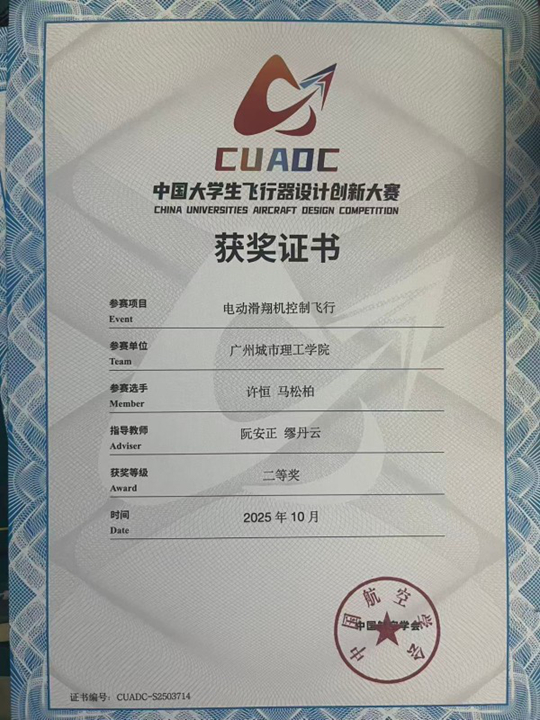 10月8日至13日,2025中國(guó)大學(xué)生飛行器設(shè)計(jì)創(chuàng)新大賽(CUADC)全國(guó)總決賽在浙江莫干山機(jī)場(chǎng)舉行。廣州城市理工學(xué)院機(jī)械工程學(xué)院/機(jī)器人工程學(xué)院“無(wú)疆航模隊(duì)”憑借扎實(shí)的技術(shù)積累、日夜兼程的鉆研與賽場(chǎng)上的出色發(fā)揮,從全國(guó)150余所高校的競(jìng)爭(zhēng)中脫穎而出,斬獲全國(guó)電動(dòng)滑翔機(jī)控制飛行項(xiàng)目二等獎(jiǎng)、限時(shí)載運(yùn)飛行項(xiàng)目三等獎(jiǎng)兩項(xiàng)殊榮。