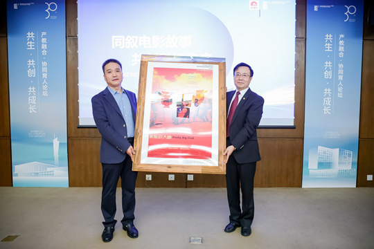 閆禹以《西部電影集團(tuán)&西安歐亞學(xué)院產(chǎn)教融合、深度合作》為題,以戰(zhàn)略級(jí)夢(mèng)想合伙人、共創(chuàng)者、踐行者、同行者的角色,展現(xiàn)了雙方在共建文旅生態(tài)方面的相關(guān)合作。通過(guò)提供豐富的實(shí)習(xí)就業(yè)崗位、多樣的交流展示平臺(tái),校企雙方打造了產(chǎn)學(xué)研一體化模式,實(shí)現(xiàn)了人才合作在多領(lǐng)域的協(xié)同發(fā)展。報(bào)告尾聲,西部電影集團(tuán)為歐亞建校30周年獻(xiàn)上了賀禮,趙國(guó)華代表學(xué)校接受賀禮。