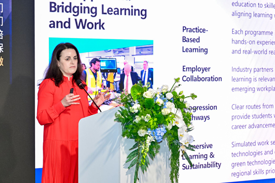 英國(guó)伯明翰大學(xué)學(xué)院副校長(zhǎng),工程、數(shù)字化與可持續(xù)建筑領(lǐng)域執(zhí)行院長(zhǎng)Rosa Wells教授以《通過(guò)實(shí)踐導(dǎo)向?qū)W習(xí) 賦能產(chǎn)業(yè)發(fā)展》為主題,系統(tǒng)地分享了歐洲產(chǎn)教融合的前沿經(jīng)驗(yàn)。她介紹,歐洲高校聚焦于“真實(shí)場(chǎng)景 + 虛擬實(shí)訓(xùn)”的融合模式,主張高校與企業(yè)共同建設(shè)安全實(shí)訓(xùn)空間,借助技術(shù)手段降低高危操作風(fēng)險(xiǎn),提高人才培養(yǎng)成效。
