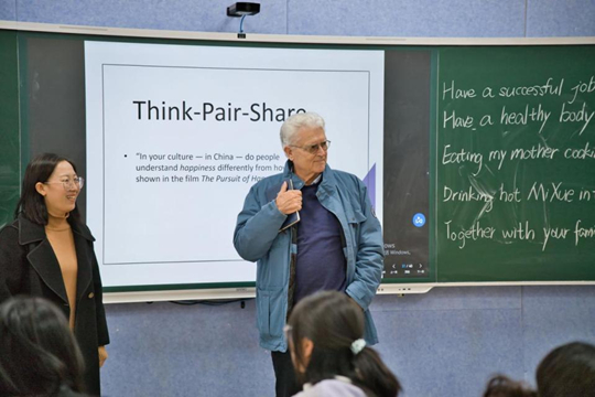 他特別鼓勵師生積極參與國際化交流,并指出:“國際化不是可選的加分項,而是未來人才必須具備的核心素養(yǎng)!笨疾焱局,他還欣賞了《油畫鑒賞與實踐》課程作品展,并走進(jìn)《大學(xué)英語》課堂,親身體驗了啟發(fā)式、互動式的小班教學(xué)氛圍。