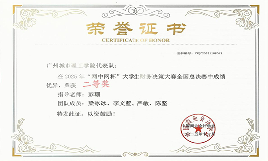 11月8日,第十三屆“網(wǎng)中網(wǎng)杯”全國大學(xué)生財務(wù)決策大賽全國總決賽落下帷幕。廣州城市理工學(xué)院國際商學(xué)院教師彭珊指導(dǎo)的學(xué)生團(tuán)隊表現(xiàn)亮眼,從全國眾多參賽隊伍中脫穎而出,最終斬獲全國總決賽二等獎,充分展現(xiàn)了學(xué)子的過硬專業(yè)素養(yǎng)與實踐能力。