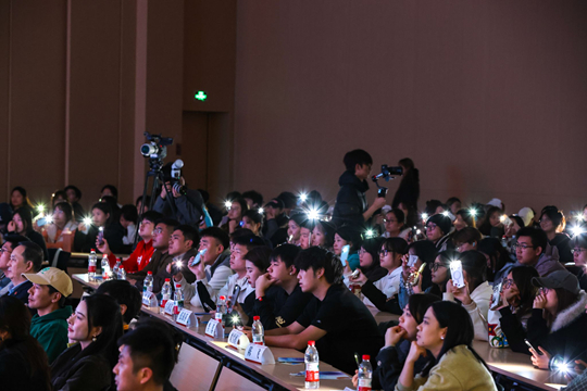 隨后的 AI 現(xiàn)場(chǎng)共創(chuàng) MV 環(huán)節(jié),將活動(dòng)氛圍推向高潮。此前,師生們?cè)谧8ι蠈?xiě)下對(duì)專(zhuān)業(yè)、對(duì)創(chuàng)作的寄語(yǔ),廣編專(zhuān)業(yè)師生即刻聯(lián)動(dòng)AI,將這些真摯祝福轉(zhuǎn)化為一首專(zhuān)屬 MV歌曲《寫(xiě)給未來(lái)的光》。當(dāng)旋律響起,全場(chǎng)同學(xué)默契打開(kāi)手機(jī)閃光燈,點(diǎn)點(diǎn)光亮如星海般搖曳,溫暖氛圍包裹整個(gè)會(huì)場(chǎng)。