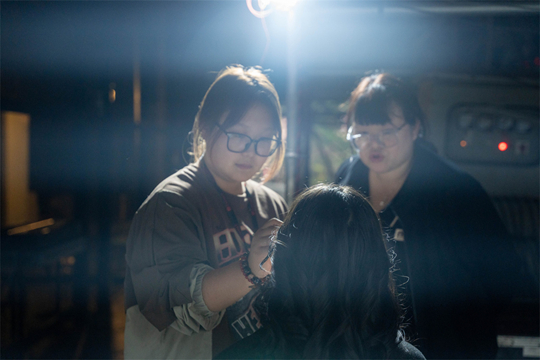 后臺化妝間里,化妝師吳穎嫻同學,懷著忐忑又熱忱的心情投入工作。“這是我第一次參與如此盛大的戲劇節(jié),握著化妝刷為演員勾勒貼合角色的眉眼,看著他們從青澀的樣子變?yōu)閯≈腥嗽谖枧_發(fā)光,成就感滿滿!倍b師楊淇同學正細心熨燙著演員們的服裝:“特別感謝學校給的機會!作為非服裝專業(yè)的愛好者,我在大涼山學到了很多彝族服飾的非遺特色,回去后想跟著老師深耕這一領域,讓傳統(tǒng)之美融入創(chuàng)作!蔽枧_一側,宣傳團隊的攝影攝像記者、文字記者,正以專業(yè)視角捕捉著每一個值得定格的瞬間,相機與無人機的靈活切換,既定格了演員演繹的細膩質感,也記錄了舞臺呈現(xiàn)的細節(jié)亮點,全方位留存下演出的精彩全貌。整個劇場內,臺前幕后,每一個人都在用專業(yè)與熱愛,共同書寫這場戲劇之旅的精彩篇章。