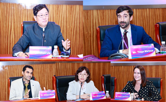 11月13日,秋高氣爽,異木棉花競(jìng)相綻放,由廣州城市理工學(xué)院主辦,國(guó)際商學(xué)院和國(guó)際交流與合作處承辦,外國(guó)語(yǔ)學(xué)院協(xié)辦的2025年國(guó)際校企協(xié)同育人論壇在行政樓703報(bào)告廳隆重舉行。本次論壇是廣州城市理工學(xué)院首次主辦全過(guò)程使用英語(yǔ)進(jìn)行的國(guó)際論壇,展示出學(xué)校日益提升的國(guó)際化辦學(xué)水平與搭建高層次國(guó)際交流平臺(tái)的能力。論壇以“國(guó)際商務(wù)新形勢(shì):探索全球勝任力應(yīng)用型人才培養(yǎng)創(chuàng)新模式”為主題,匯聚了來(lái)自葡萄牙、美國(guó)、巴基斯坦、印度等國(guó)家的專家學(xué)者與企業(yè)領(lǐng)袖,共同探討國(guó)際商務(wù)教育創(chuàng)新與全球勝任型人才培養(yǎng)的新路徑。葡萄牙駐廣州總領(lǐng)事館(以下簡(jiǎn)稱總領(lǐng)事館)貿(mào)易與文化事務(wù)高級(jí)官員Mariana Amado da Silva女士、葡萄牙里斯本大學(xué)學(xué)院(以下簡(jiǎn)稱里斯本大學(xué)學(xué)院)Ricardo Paes Mamede教授、JOINCO Import & Export Ltd.(以下簡(jiǎn)稱JOINCO公司)首席執(zhí)行官Pedro Cunha先生、中國(guó)區(qū)負(fù)責(zé)人Tiago Mateus先生、廣州市圣瑞吉貿(mào)易有限公司創(chuàng)始人Shyju Thumbrayil先生、廣州瀚卓藥業(yè)有限公司創(chuàng)始人羅文航等嘉賓與近200名師生參加了論壇。學(xué)校副校長(zhǎng)劉洊波教授作歡迎致辭,校長(zhǎng)蘇成教授作論壇主旨報(bào)告,會(huì)議由國(guó)際商學(xué)院院長(zhǎng)安然教授主持。
