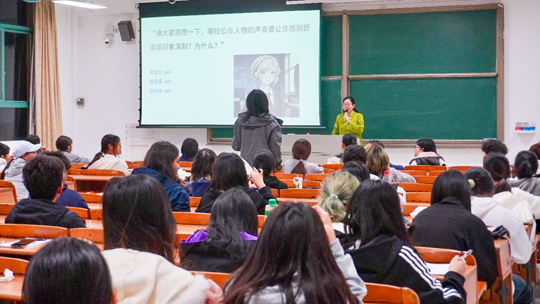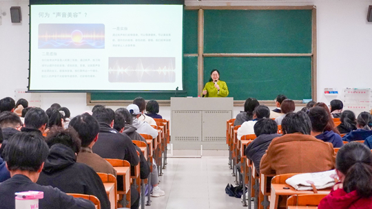 講座以“生活中哪些聲音讓人感到舒適”為切入點(diǎn),逐步引導(dǎo)師生思考聲音在日常交流與藝術(shù)表達(dá)中的重要性。湯賀鳳老師圍繞“聲音的價(jià)值”與“聲音美容”的內(nèi)涵展開(kāi)講解,指出聲音作為“第二張臉”和“無(wú)形名片”的獨(dú)特作用,激發(fā)了師生對(duì)聲音訓(xùn)練的濃厚興趣。她進(jìn)一步闡釋,朗誦不僅是一種大聲誦讀的語(yǔ)言形式,更是一門融合語(yǔ)言、聲音與表演的綜合藝術(shù),強(qiáng)調(diào)通過(guò)準(zhǔn)確的聲音表達(dá)傳遞作品的情感與思想。