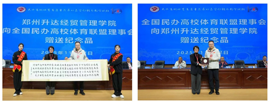 儀式現(xiàn)場,鄭州升達(dá)經(jīng)貿(mào)管理學(xué)院校長張欣與全國民辦高校體育聯(lián)盟理事長姜波博士互贈(zèng)紀(jì)念品。這份互贈(zèng)不僅承載著升達(dá)學(xué)院對(duì)聯(lián)盟的誠摯謝意,更凝聚了雙方深化合作、共促民辦高校體育教育發(fā)展的美好愿景。