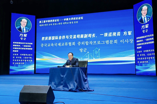 在主旨報告環(huán)節(jié),教育部國際合作與交流司原副司長、一級巡視員、中國駐多倫多總領(lǐng)館原教育參贊方軍系統(tǒng)解讀了國家教育強國戰(zhàn)略背景下,國際合作與中外合作辦學(xué)的新定位與新機遇,指出當(dāng)前中外合作辦學(xué)已進入“擴容、提質(zhì)、增效”并重的新階段,政策支持力度持續(xù)加大,審批流程不斷優(yōu)化,正迎來快速發(fā)展的戰(zhàn)略窗口期。他鼓勵中韓高校把握政策機遇,積極開展高水平、實質(zhì)性的合作辦學(xué)與協(xié)同創(chuàng)新。