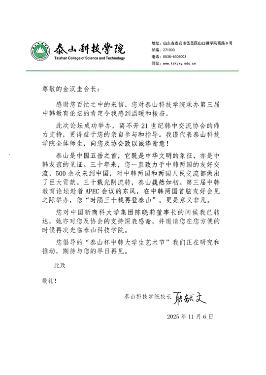 | 第三屆中韓教育論壇成果豐碩,韓中交流協(xié)會會長金漢圭專函致謝泰山科技學(xué)院 |